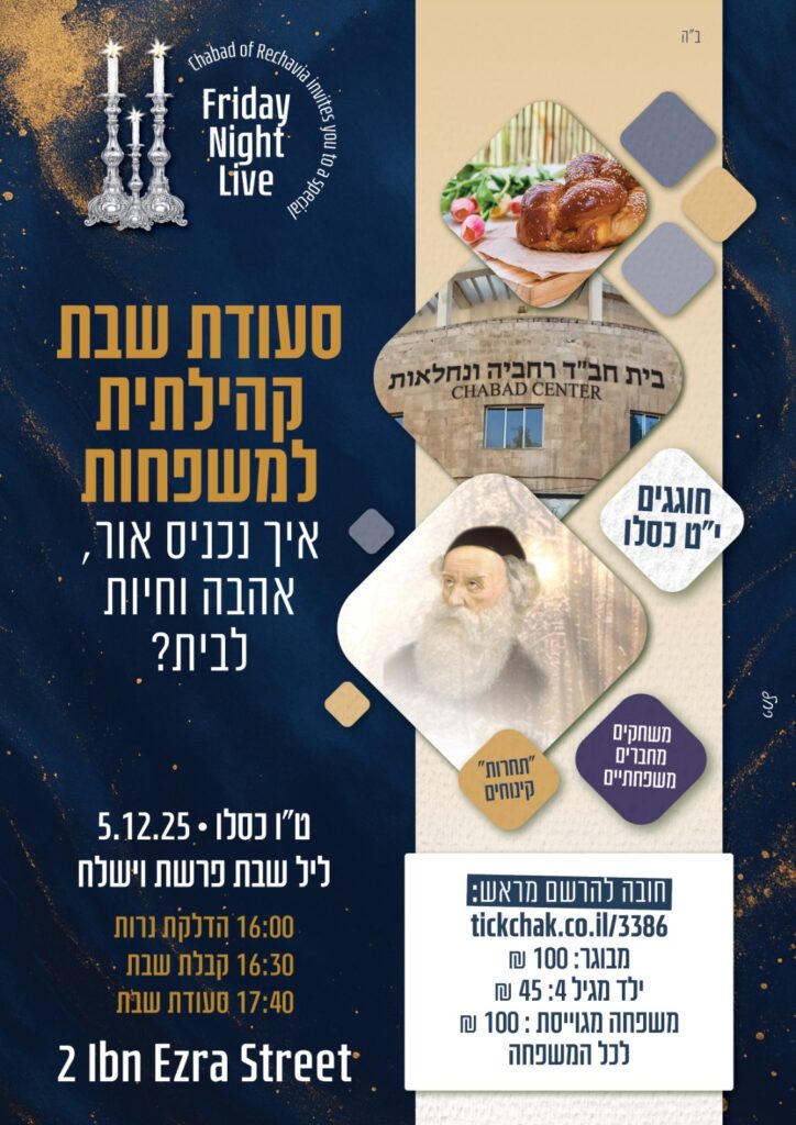 בית חב״ד רחביה מזמין אתכם לסעודת ליל שבת קהילתית למשפחות