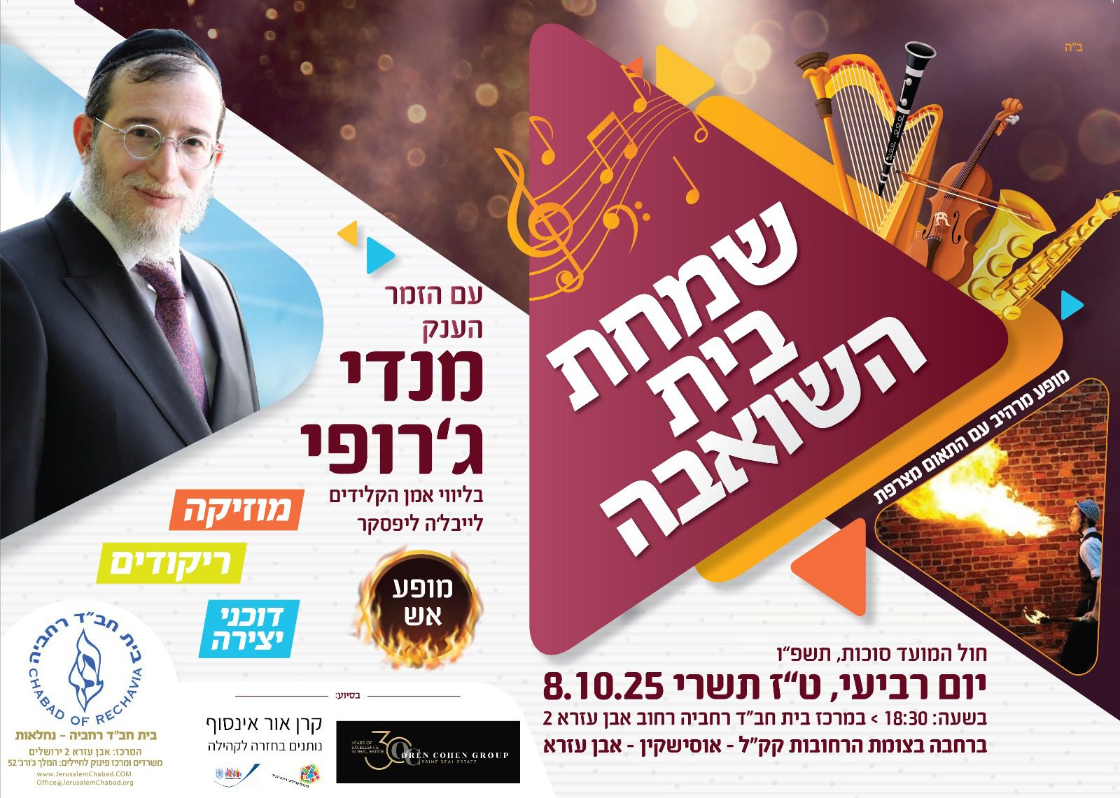 עם הזמר הענק מנדי ג'רופי יום רביעי, ט"ז בתשרי,8.10.25 18:30 אנחנו שמחים להזמין אותך ואת כל משפחתך לחגיגת שמחת בית השואבה המרכזית בשכונות רחביה ונחלאות במרכז