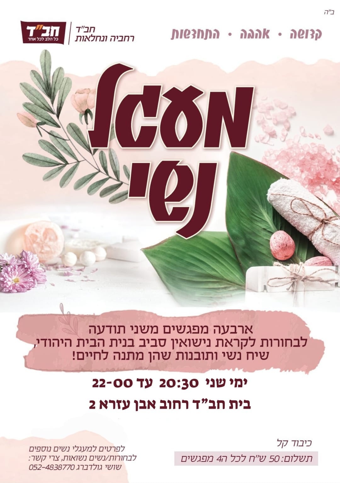 את מוזמנת לארבעה מפגשים משני תודעה לבחורות לקראת נישואין סביב בנית הבית היהודית בימי שני 20:30-22:00 בית חב"ד רחביה ונחלאות 2 רחוב אבן עזרא:נעמיק בנושאים* אהבה וקדושה כתכלית