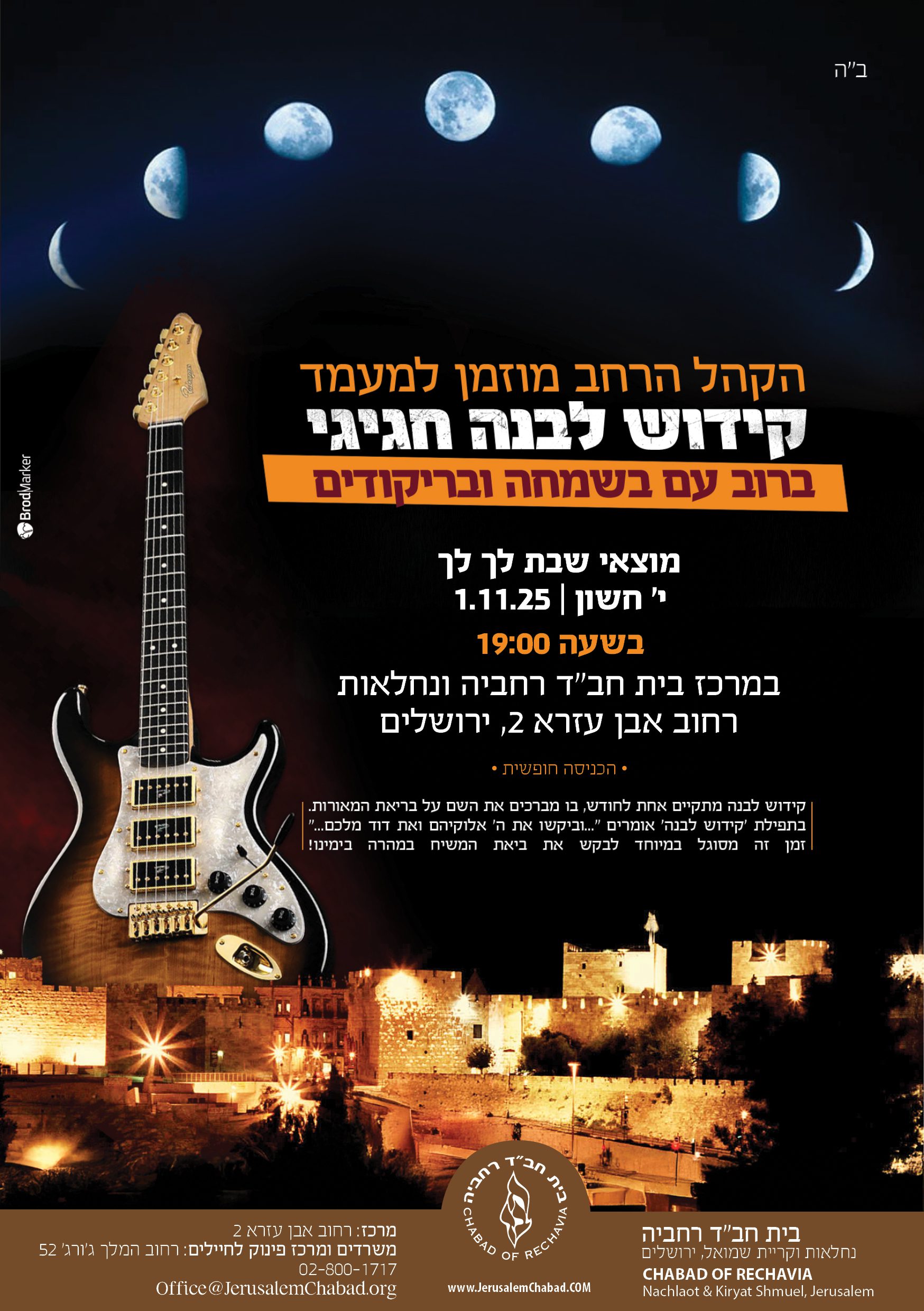 מוצאי שבת לך לךי' חשון | 1.11.25בשעה 19:00 בית חב"ד רחביה ונחלאות 2 רחוב אבן עזרא הכניסה חופשית קידוש לבנה מתקיים אחת לחודש, בו מברכים את השם על בריאת