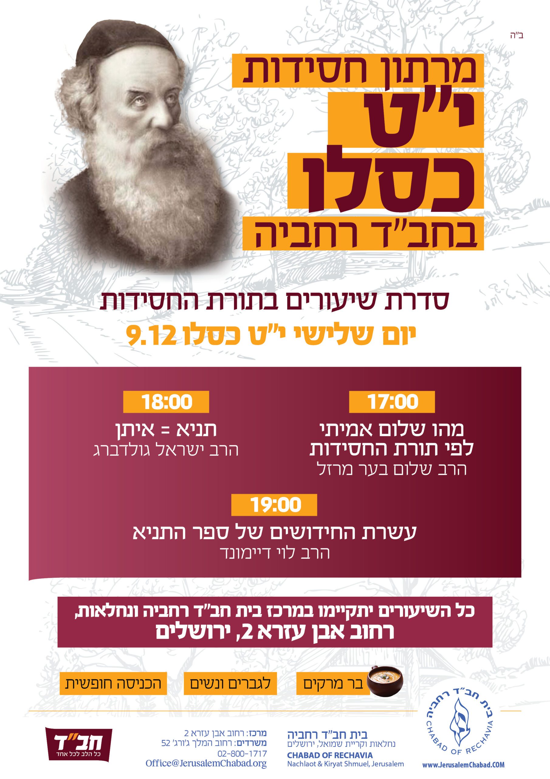 סדרת שיעורים בתורת החסידות ✨📘 17:00 🕔מהו שלום אמיתי לפי תורת החסידות 🙏 הרב שלום בער מרזל 18:00 🕔תניא = איתן 📘 הרב ישראל גולדברג 19:00 🕔עשרת החידושים של ספר התניא💡 הרב לוי דיימונד 9.12.25 | יום