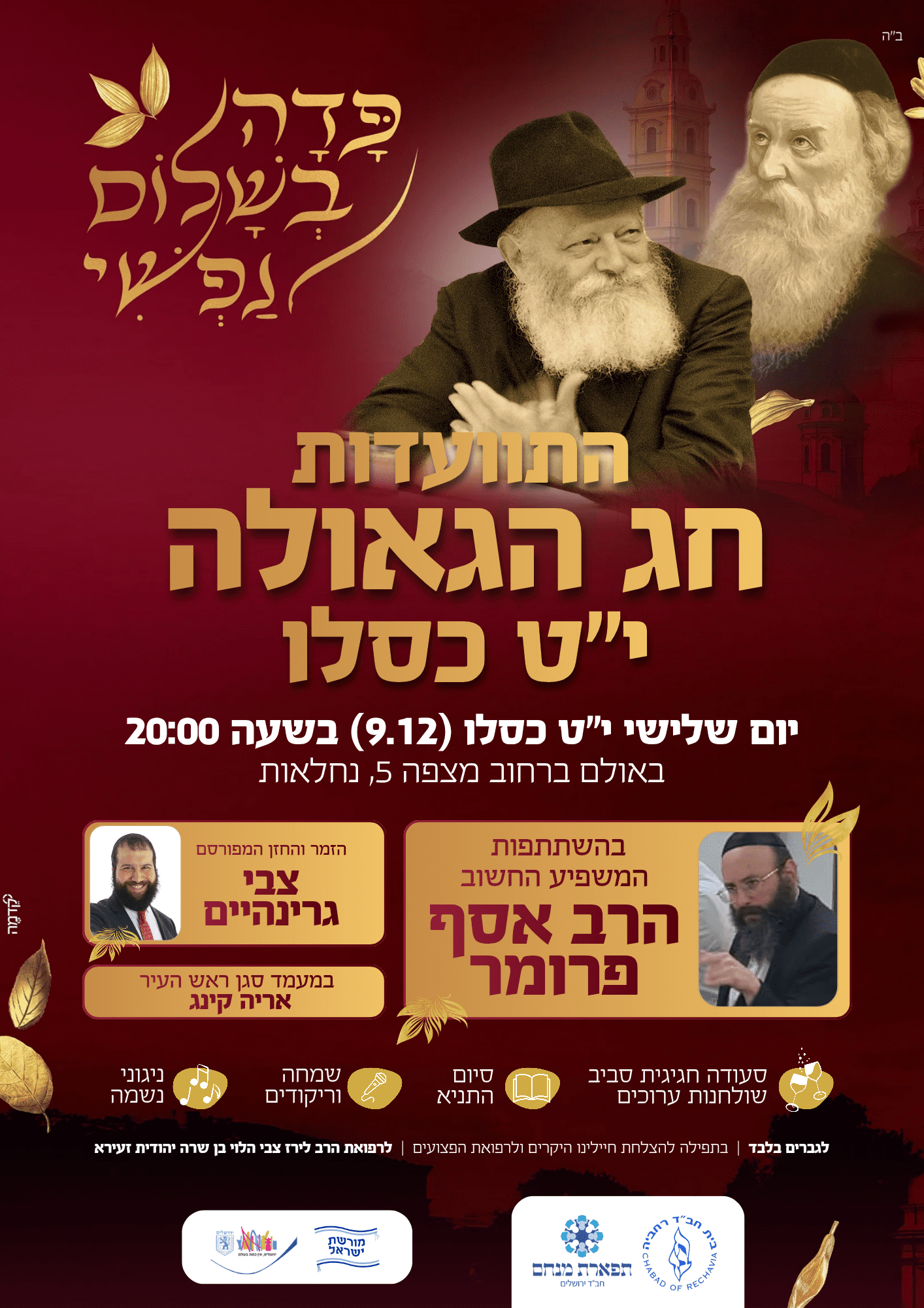 חוגגים י"ט כסלו סעודת ליל שבת בית חב״ד רחביה מזמין אתכם לסעודת ליל שבת קהילתית למשפחות אווירה חמה ומרגשת🕯️ קייטרינג מלא ועשיר 🍽️ "אמירת “לחיים 🍷שירי שבת שמחממים את הלב🎶 שבת של חיבור, ושמחה