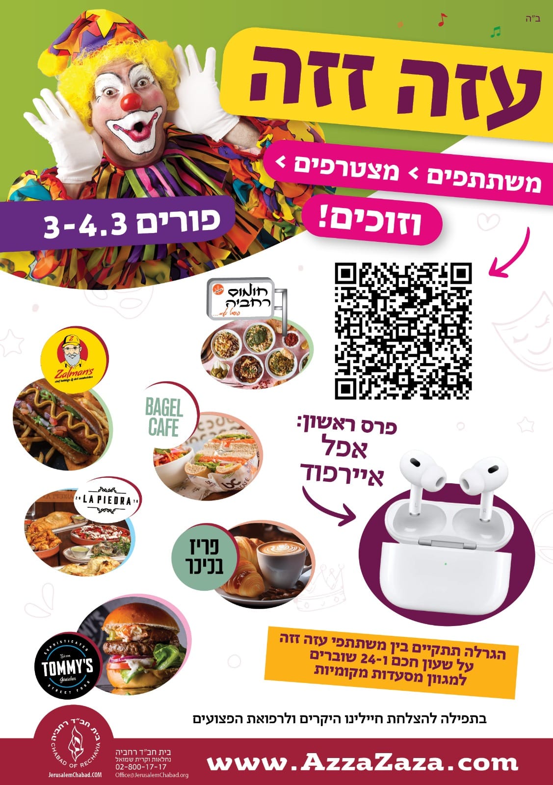הצטרפו לבית חב"ד רחביה בחג פורים בפרויקט עזה זזה והשתתפו בהגרלה כדי לזכות באחד מהפרסים המדהימים פרס ראשון: אפל איירפוד כמו כן, תוכל לזכות
