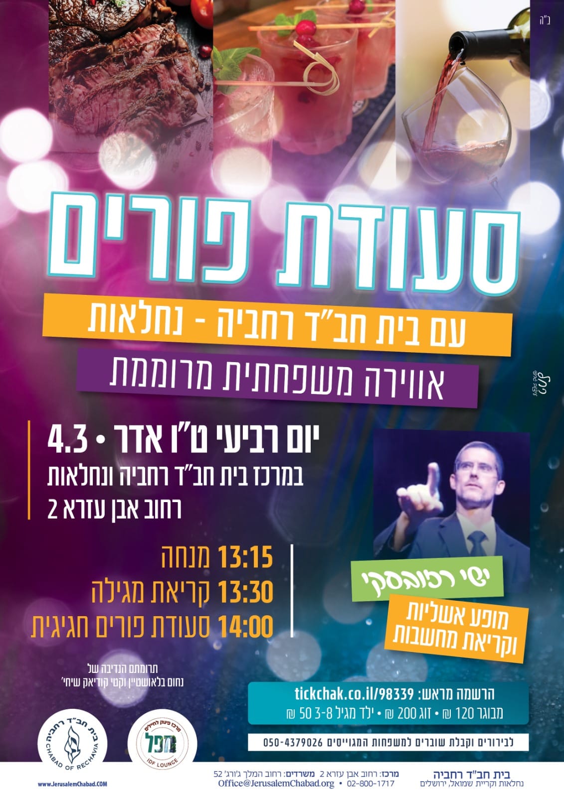 יום רביעי, ט"ו אדר 📅 במרכז בית חב"ד רחביה ונחלאות 📍רחוב אבן עזרא 2 מופע אשלית וראיאת מחשבות🧠עם ישי רסובסקי מנחהd13:15 📖 קריאת מגילהd13:30 🎭סעודת פורים חגיגיתs14:00 🍽️ הרשמה מראש חובה למטה מבוגר: