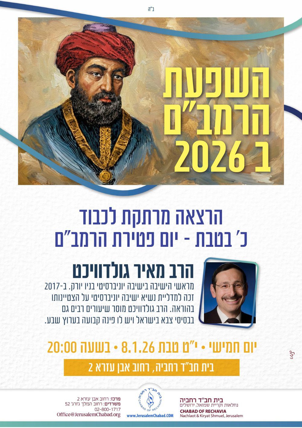 הרצאה מרתקת לכבוד כ׳ בטבת – יום פטירת הרמב״ם הרב מאיר גולדוויכט מראשי הישיבה בישיבה יוניברסיטי בניו־יורק ב-2017 זכה למדליית נשיא ישיבה יוניברסיטי על הצטיינותו בהוראה