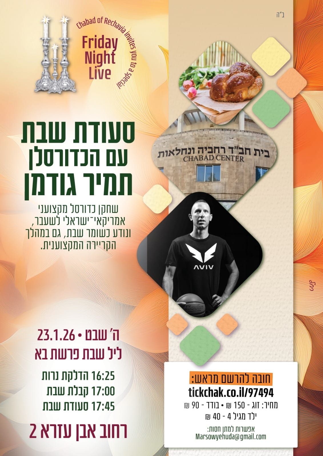 שחקן כדורסל מקצועי אמריקאי-ישראלי לשעברונודע כשומר שבת, גם במהלך הקריירה המקצועית אווירה חמה ומרגשת🔥 קייטרינג מלא ועשיר 🍽️ "אמירת “לחיים 🍷שירי שבת שמחממים את הלב🎶 :זמני הערב 16:25 הדלקת נרות 🕯️ 17:00 קבלת שבת 🎶 17:45
