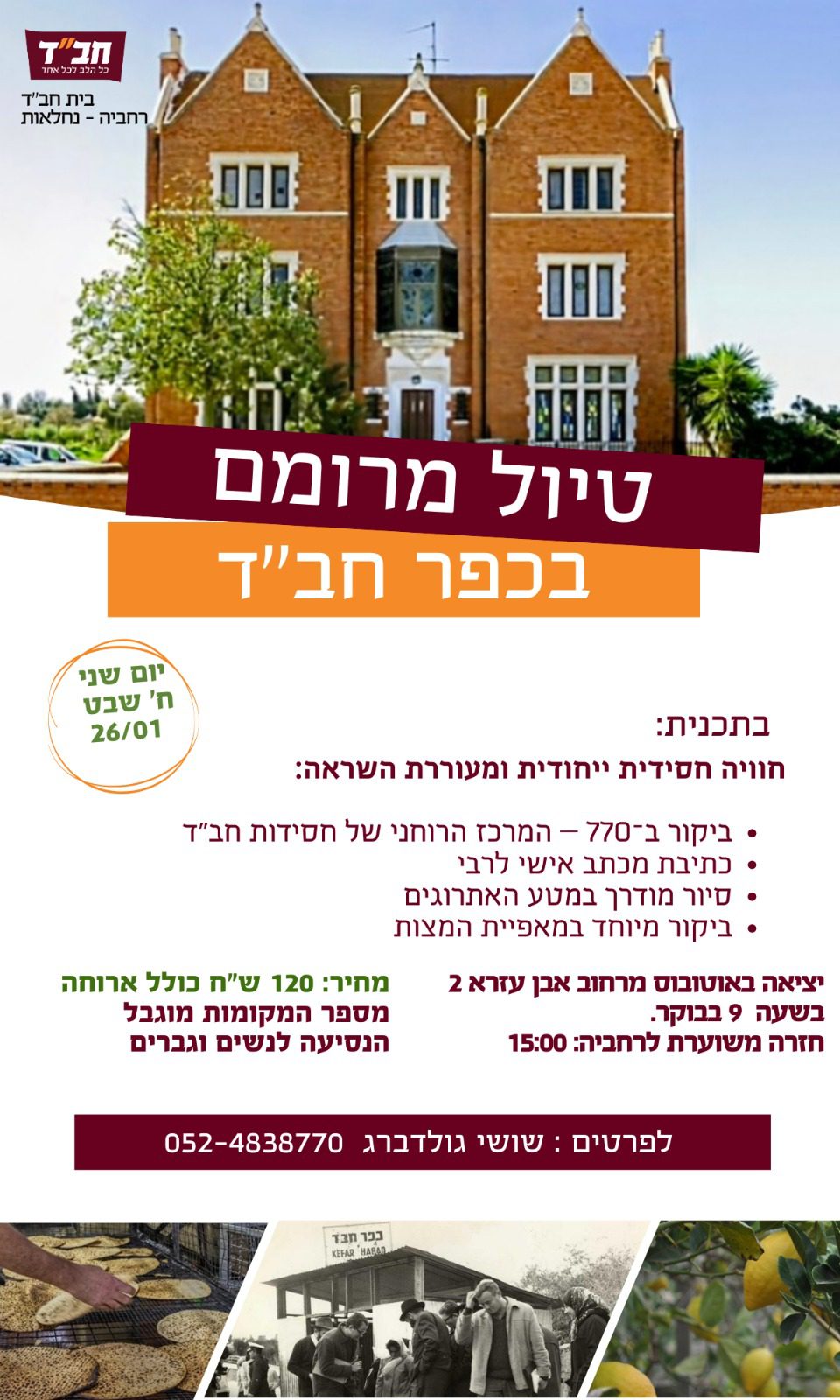 אתם מוזמנים לחוויה חסידית ייחודית ומעוררת השראה ביקור ב־770 – המרכז הרוחני של חסידות חב״ד 🏰 כתיבת מכתב אישי לרבי 📝 סיור מודרך במשק האתרוגים 🍋 ביקור מיוחד במאפיית