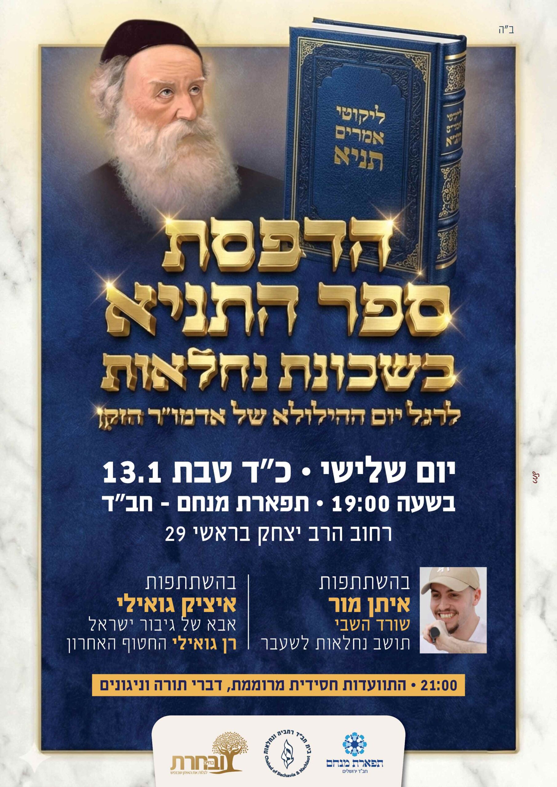בשכונת נחלאות לרגל יום ההילולא של אדמו"ר הזקן בהשתתפות איתן מור, שורד השביתושב נחלאות לשעבר בהשתתפות איציק גואלי אבא של גיבור ישראלי רן גואלי החטוף האחרון 13.1.26 ,יום שלישי, כ"ד טבת 🗓️19:00⏱️ תפארת מנחם – חב"ד📍רחוב