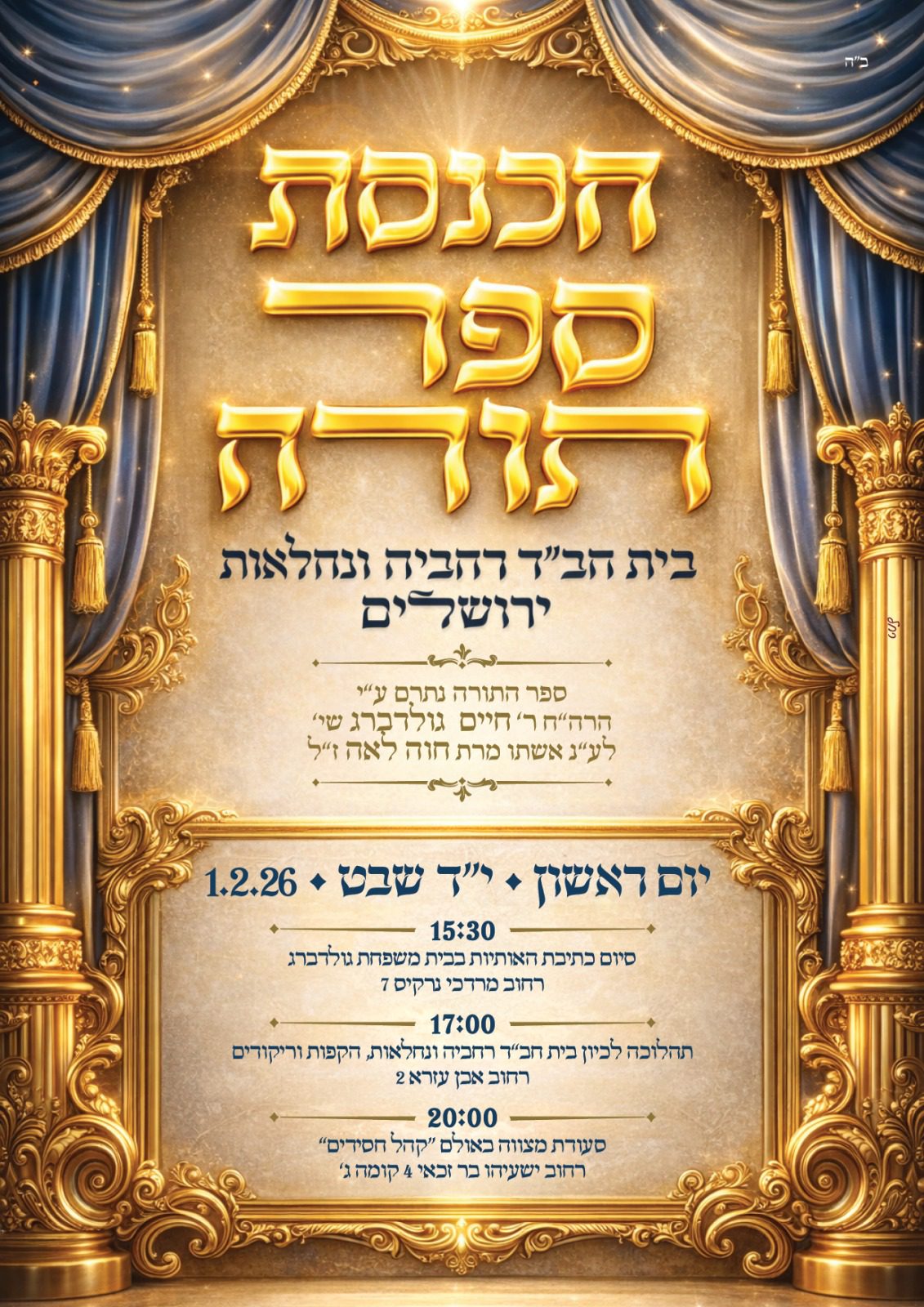 ספר התורה נתרם ע”י'הרה”ח ר’ חיים גולדברג שי לע”נ אשתו מרת חוה לאה ז”ל יום ראשון | י”ד שבט | 1.2.26 📅 ~ 15:30 ~ סיום כתיבת האותיות בבית משפחת