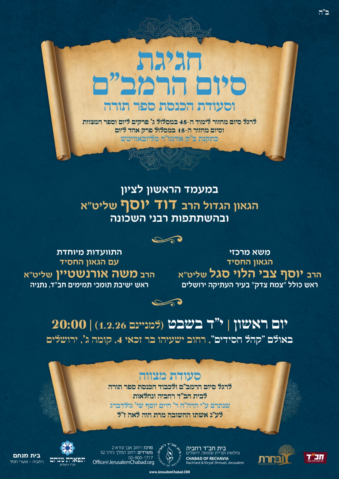 יום ראשון | י”ד שבט | 1.2.26 📅 "באולם “קהל חסידים📍'רחוב ישעיהו בר זכאי 4, קומה ג לרגל סיום מחזור לימוד ה-45 במסלול